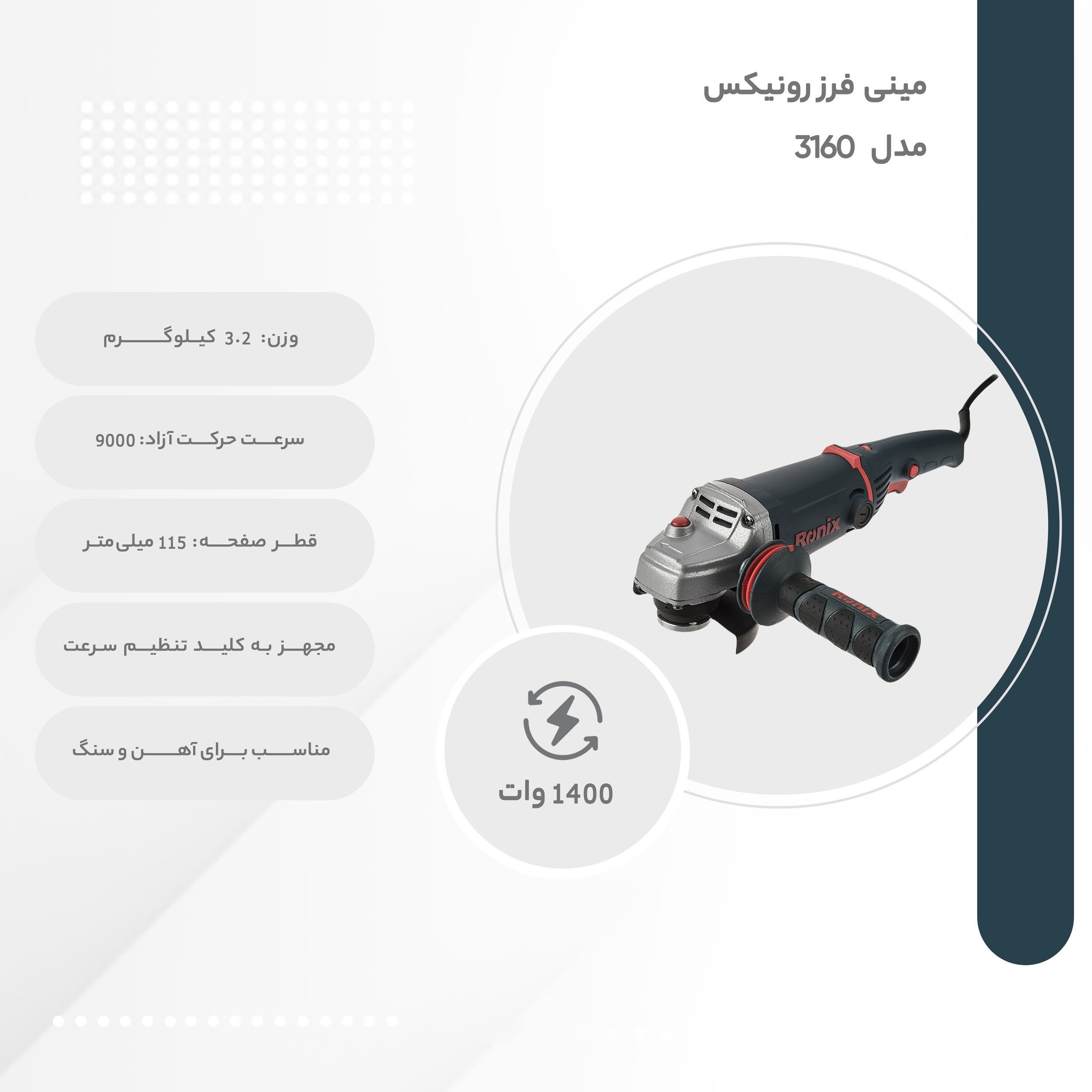 دستگاه مینی فرز فوق یکی از محصولات تولیدی شرکت «رونیکس» (Ronix) است. این شرکت تجربهی بالایی در زمینهی تولید انواع ابزارهای دستی و برقی دارد و این دستگاه مینی فرز را با نام «3160» به بازار عرضه کرده است. این مینی فرز سرعت گردشی برابر 9000 دور بر دقیقه دارد و میتوانید با کمک آن به برش و ساب فلز و حتی سنگ بپردازید. این محصول توانی برابر 1400 وات دارد و از قابلیت کنترل سرعت سود میبرد. این مزیت در بسیاری از دستگاههای مینی فرز وجود ندارد و همین موضوع موجب محبوبیت بیشتر این دستگاه شده است. شرکت رونیکس به همراه این فرز یک دستهی کمکی عرضه کرده است که با کمک آن میتوانید با تسلط بیشتری کار کنید. از دیگر مزیتهای این دستگاه میتوان به قفل سوییچ آن اشاره کرد که با وجود آن دیگر به نگه داشتن شستی دستگاه برای برش یا ساب نیاز ندارید. قطر صفحهی مناسب برای این مینی فرز 115 میلیمتر بوده و اندازه سوراخ مرکزی آن 14 میلیمتر طراحی شده است. کابل برق این مینی فرز طولی 3 متری دارد.