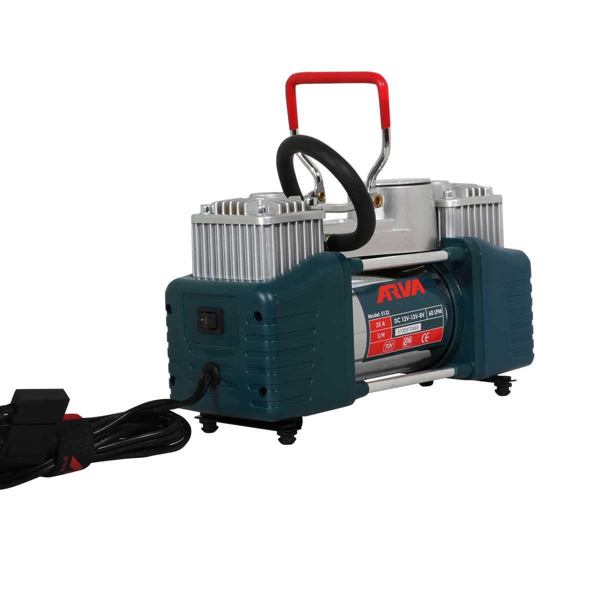 کمپرسور باد فندکی آروا مدل 5132 دو سیلندر پرقدرت با ولتاژ 12 ولت و خروجی هوا به میزان 60 لیتر می تواند تایر خودرو را در دو الی سه دقیقه پر کند، همچنین مجهز به موتور پر قدرت با تولید هوا با فشار 150 پاسکال است.